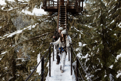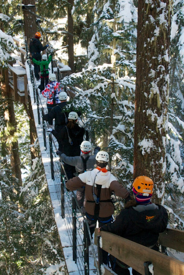 Your inspiring journey through the forest happens via a combination of ziplines, ground based trails, observation platforms, and depending on the location, suspension bridges. Ziplines are suspended steel cables - some of which are over 15 stories high and 7,000 feet long - that you ride from platform to platform. In order to fly on the zipline cables you are outfitted with a custom harness that is then attached to the zipline with a specialized pulley. At each aerial launch platform you simply and bravely step down the stairs until there is tension on the harness tethers, lift your feet and soar down the line reaching speeds up to 100 km/hr (62 mph). The harness system allows you complete freedom to move, take a look around and even enjoy your zipline ride hanging upside down if you wish.